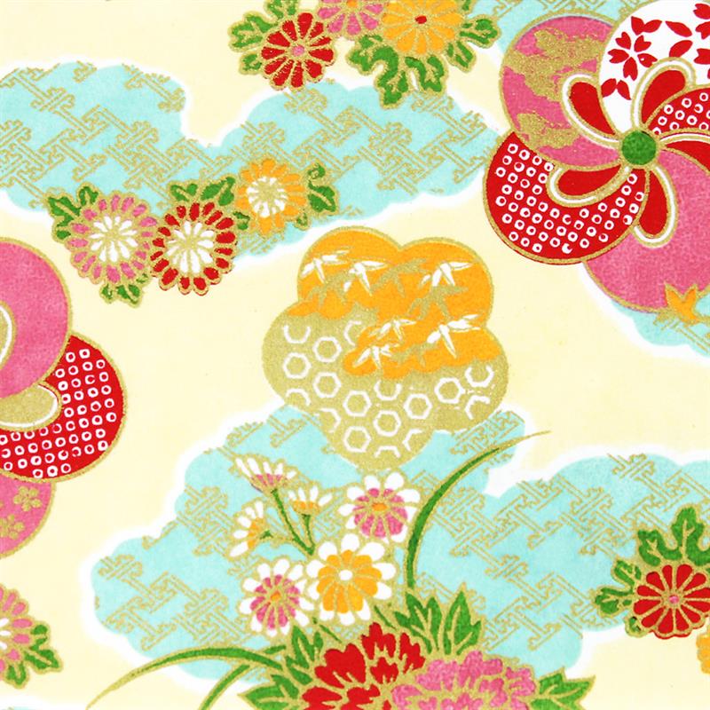 Hand-Dyed Yuzen paper is a kind of decorative paper screen-printed with multi-color. Japanese classical pattern designed with modern touch boldly and delicately, known as “Beauties of nature”, is used on this paper. “Beauties of nature” are also often used in kimono and most these bright, rich colors and motifs signify good fortune. This paper can be used in various ways, for example, wrapping, decorating walls and so on. This paper is made of Echizen washi paper produced in Echizen City (Fukui Prefecture, Japan). Washi paper in this area is designated as an Important Intangible Cultural Property of Japan, and has an established reputation for its high quality. Yuzen paper is hand-dyed color by color, so has some displacements of the patterns and color shadings. Thanks to these, it has a tasteful, unique texture or, a characteristic of hand-dyed products.