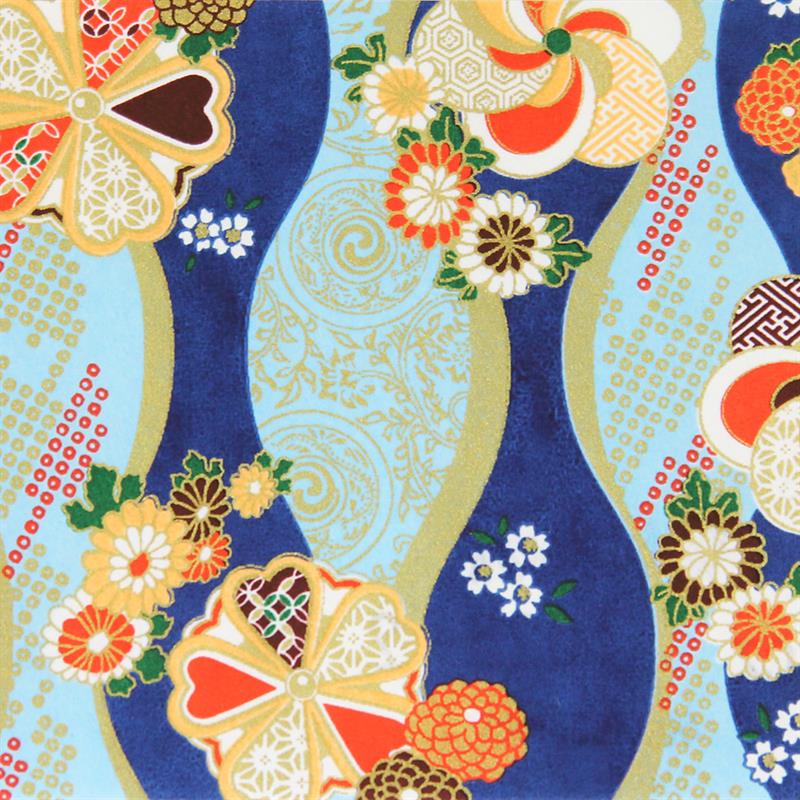 Hand-Dyed Yuzen paper is a kind of decorative paper screen-printed with multi-color. Japanese classical pattern designed with modern touch boldly and delicately, known as “Beauties of nature”, is used on this paper. “Beauties of nature” are also often used in kimono and most these bright, rich colors and motifs signify good fortune. This paper can be used in various ways, for example, wrapping, decorating walls and so on. This paper is made of Echizen washi paper produced in Echizen City (Fukui Prefecture, Japan). Washi paper in this area is designated as an Important Intangible Cultural Property of Japan, and has an established reputation for its high quality. Yuzen paper is hand-dyed color by color, so has some displacements of the patterns and color shadings. Thanks to these, it has a tasteful, unique texture or, a characteristic of hand-dyed products.