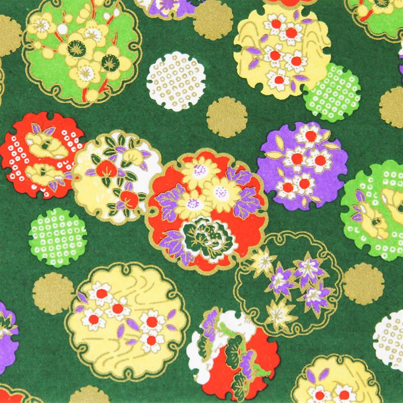 Hand-Dyed Yuzen paper is a kind of decorative paper screen-printed with multi-color. Japanese classical pattern designed with modern touch boldly and delicately, known as “Beauties of nature”, is used on this paper. “Beauties of nature” are also often used in kimono and most these bright, rich colors and motifs signify good fortune. This paper can be used in various ways, for example, wrapping, decorating walls and so on. This paper is made of Echizen washi paper produced in Echizen City (Fukui Prefecture, Japan). Washi paper in this area is designated as an Important Intangible Cultural Property of Japan, and has an established reputation for its high quality. Yuzen paper is hand-dyed color by color, so has some displacements of the patterns and color shadings. Thanks to these, it has a tasteful, unique texture or, a characteristic of hand-dyed products. size: 525 x 660 mm (pattern area: 500 x 635 mm)
