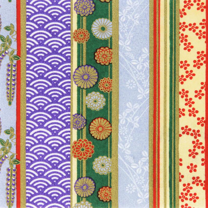 Hand-Dyed Yuzen paper is a kind of decorative paper screen-printed with multi-color. Japanese classical pattern designed with modern touch boldly and delicately, known as “Beauties of nature”, is used on this paper. “Beauties of nature” are also often used in kimono and most these bright, rich colors and motifs signify good fortune. This paper can be used in various ways, for example, wrapping, decorating walls and so on. This paper is made of Echizen washi paper produced in Echizen City (Fukui Prefecture, Japan). Washi paper in this area is designated as an Important Intangible Cultural Property of Japan, and has an established reputation for its high quality. Yuzen paper is hand-dyed color by color, so has some displacements of the patterns and color shadings. Thanks to these, it has a tasteful, unique texture or, a characteristic of hand-dyed products.