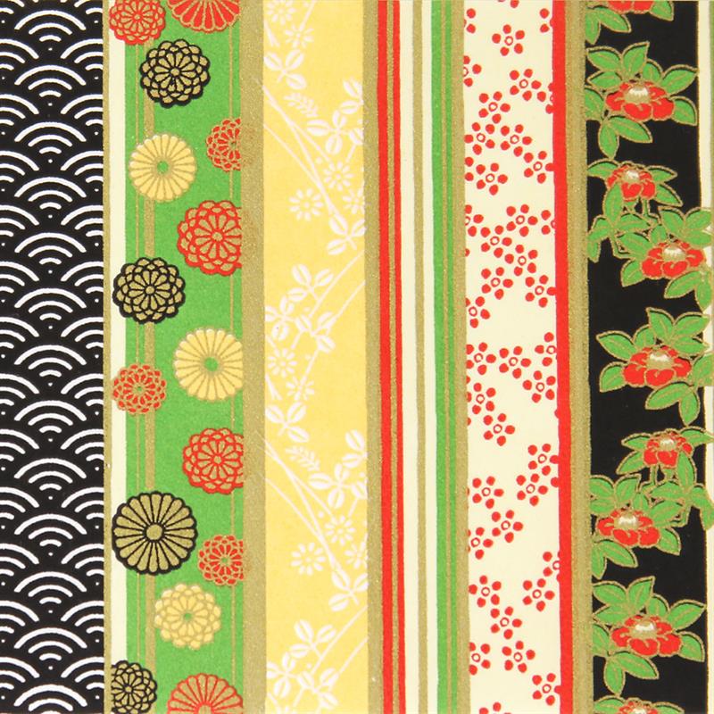 Hand-Dyed Yuzen paper is a kind of decorative paper screen-printed with multi-color. Japanese classical pattern designed with modern touch boldly and delicately, known as “Beauties of nature”, is used on this paper. “Beauties of nature” are also often used in kimono and most these bright, rich colors and motifs signify good fortune. This paper can be used in various ways, for example, wrapping, decorating walls and so on. This paper is made of Echizen washi paper produced in Echizen City (Fukui Prefecture, Japan). Washi paper in this area is designated as an Important Intangible Cultural Property of Japan, and has an established reputation for its high quality. Yuzen paper is hand-dyed color by color, so has some displacements of the patterns and color shadings. Thanks to these, it has a tasteful, unique texture or, a characteristic of hand-dyed products. size: 525 x 660 mm (pattern area: 500 x 635 mm)