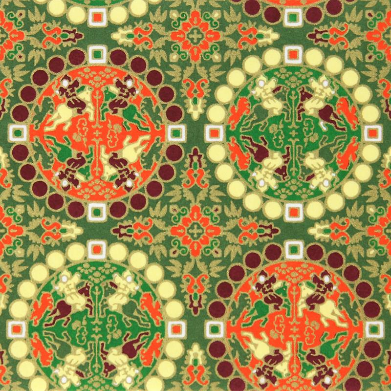 Hand-Dyed Yuzen paper is a kind of decorative paper screen-printed with multi-color. Japanese classical pattern designed with modern touch boldly and delicately, known as “Beauties of nature”, is used on this paper. “Beauties of nature” are also often used in kimono and most these bright, rich colors and motifs signify good fortune. This paper can be used in various ways, for example, wrapping, decorating walls and so on. This paper is made of Echizen washi paper produced in Echizen City (Fukui Prefecture, Japan). Washi paper in this area is designated as an Important Intangible Cultural Property of Japan, and has an established reputation for its high quality. Yuzen paper is hand-dyed color by color, so has some displacements of the patterns and color shadings. Thanks to these, it has a tasteful, unique texture or, a characteristic of hand-dyed products. size: 525 x 660 mm (pattern area: 500 x 635 mm)