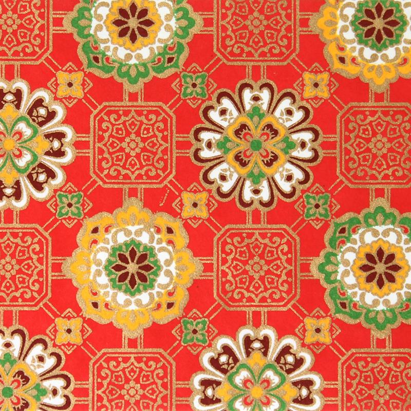 Hand-Dyed Yuzen paper is a kind of decorative paper screen-printed with multi-color. Japanese classical pattern designed with modern touch boldly and delicately, known as “Beauties of nature”, is used on this paper. “Beauties of nature” are also often used in kimono and most these bright, rich colors and motifs signify good fortune. This paper can be used in various ways, for example, wrapping, decorating walls and so on. This paper is made of Echizen washi paper produced in Echizen City (Fukui Prefecture, Japan). Washi paper in this area is designated as an Important Intangible Cultural Property of Japan, and has an established reputation for its high quality. Yuzen paper is hand-dyed color by color, so has some displacements of the patterns and color shadings. Thanks to these, it has a tasteful, unique texture or, a characteristic of hand-dyed products.