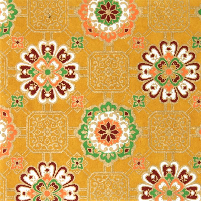 Hand-Dyed Yuzen paper is a kind of decorative paper screen-printed with multi-color. Japanese classical pattern designed with modern touch boldly and delicately, known as “Beauties of nature”, is used on this paper. “Beauties of nature” are also often used in kimono and most these bright, rich colors and motifs signify good fortune. This paper can be used in various ways, for example, wrapping, decorating walls and so on. This paper is made of Echizen washi paper produced in Echizen City (Fukui Prefecture, Japan). Washi paper in this area is designated as an Important Intangible Cultural Property of Japan, and has an established reputation for its high quality. Yuzen paper is hand-dyed color by color, so has some displacements of the patterns and color shadings. Thanks to these, it has a tasteful, unique texture or, a characteristic of hand-dyed products. size: 525 x 660 mm (pattern area: 500 x 635 mm)