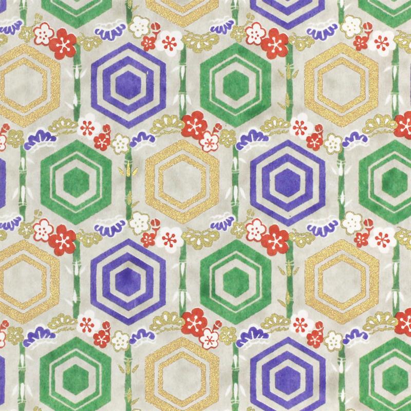Hand-Dyed Yuzen paper is a kind of decorative paper screen-printed with multi-color. Japanese classical pattern designed with modern touch boldly and delicately, known as “Beauties of nature”, is used on this paper. “Beauties of nature” are also often used in kimono and most these bright, rich colors and motifs signify good fortune. This paper can be used in various ways, for example, wrapping, decorating walls and so on. This paper is made of Echizen washi paper produced in Echizen City (Fukui Prefecture, Japan). Washi paper in this area is designated as an Important Intangible Cultural Property of Japan, and has an established reputation for its high quality. Yuzen paper is hand-dyed color by color, so has some displacements of the patterns and color shadings. Thanks to these, it has a tasteful, unique texture or, a characteristic of hand-dyed products. size: 525 x 660 mm (pattern area: 500 x 635 mm)