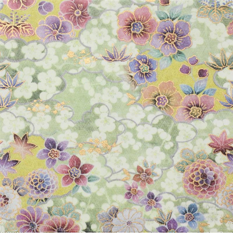 “Kyo” means Kyoto and “koromo” means clothing, especially kimono. On this decorative paper, kimono patterns are used as a motif. Beautiful traditional patterns designed modernly and golden paint are used elegantly and effectively. This paper can be used in various ways, for example, wrapping, decorating walls and so on. This paper is made of Echizen washi paper produced in Echizen City (Fukui Prefecture, Japan). Washi paper in this area is designated as an Important Intangible Cultural Property of Japan, and has an established reputation for its high quality. size: 480 x 650 mm (pattern area: 462 x 632 mm)