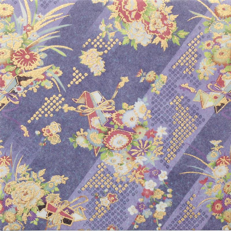 “Kyo” means Kyoto and “koromo” means clothing, especially kimono. On this decorative paper, kimono patterns are used as a motif. Beautiful traditional patterns designed modernly and golden paint are used elegantly and effectively. This paper can be used in various ways, for example, wrapping, decorating walls and so on. This paper is made of Echizen washi paper produced in Echizen City (Fukui Prefecture, Japan). Washi paper in this area is designated as an Important Intangible Cultural Property of Japan, and has an established reputation for its high quality. size: 480 x 650 mm (pattern area: 462 x 632 mm)