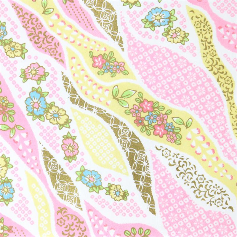 華やかな友禅文様を、多色刷りの技法(スクリーン印刷)で和紙に印刷しています。