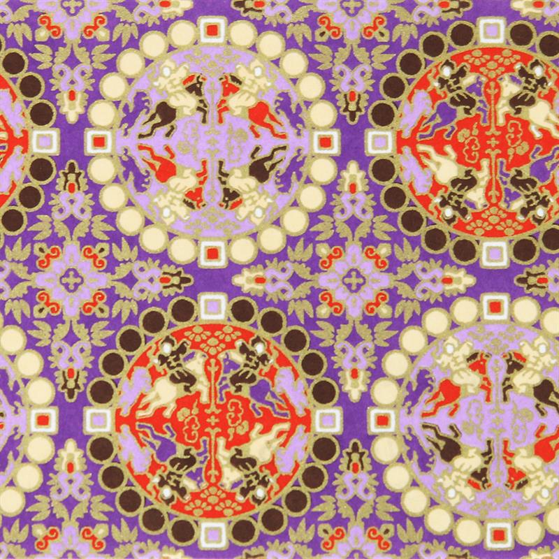柄名:正倉院 獅子狩文様 華やかな友禅文様を、多色刷りの技法(スクリーン印刷)で和紙に印刷しています。 【商品仕様】 品番:CZ4055-003 寸法:原紙 525×660mm、柄部分 500×635mm 内容:- 素材:和紙 個装:- 包装:紙包 備考:- 【手染友禅和紙について】 当社の手染友禅和紙は1色ずつ手作業で加工しています。 そのため多少の柄のズレや染め色のゆらぎが生じ、味わい深く独特の風合いが生まれます。 手染めの特徴としてご理解ください。