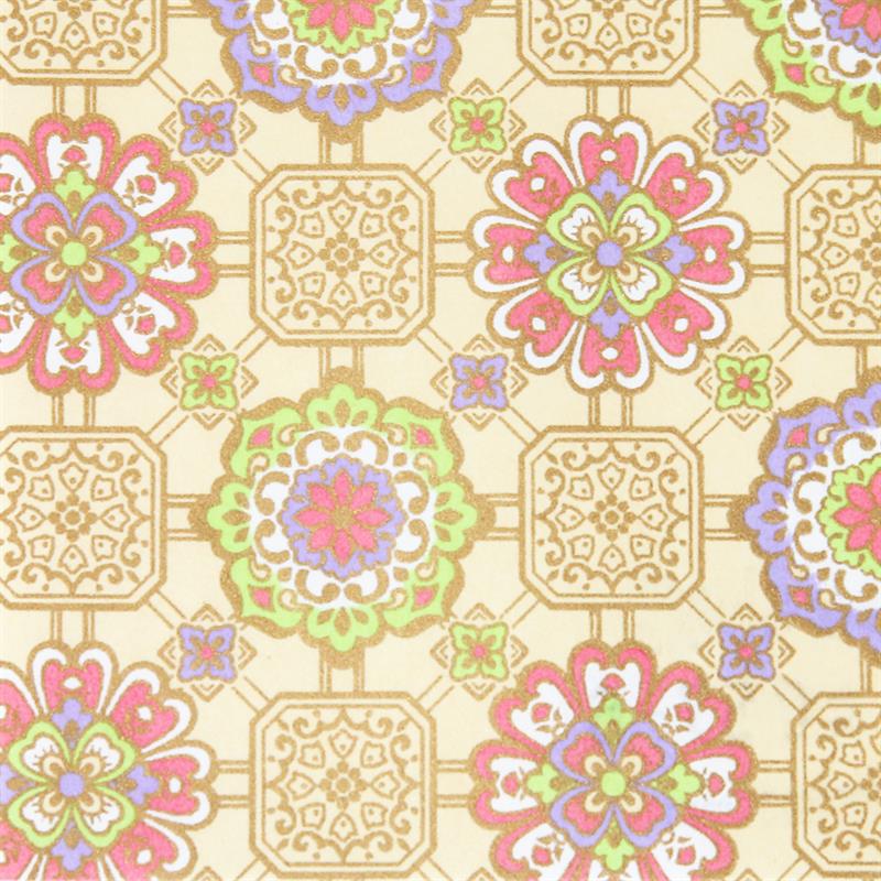 華やかな友禅文様を、多色刷りの技法(スクリーン印刷)で和紙に印刷しています。