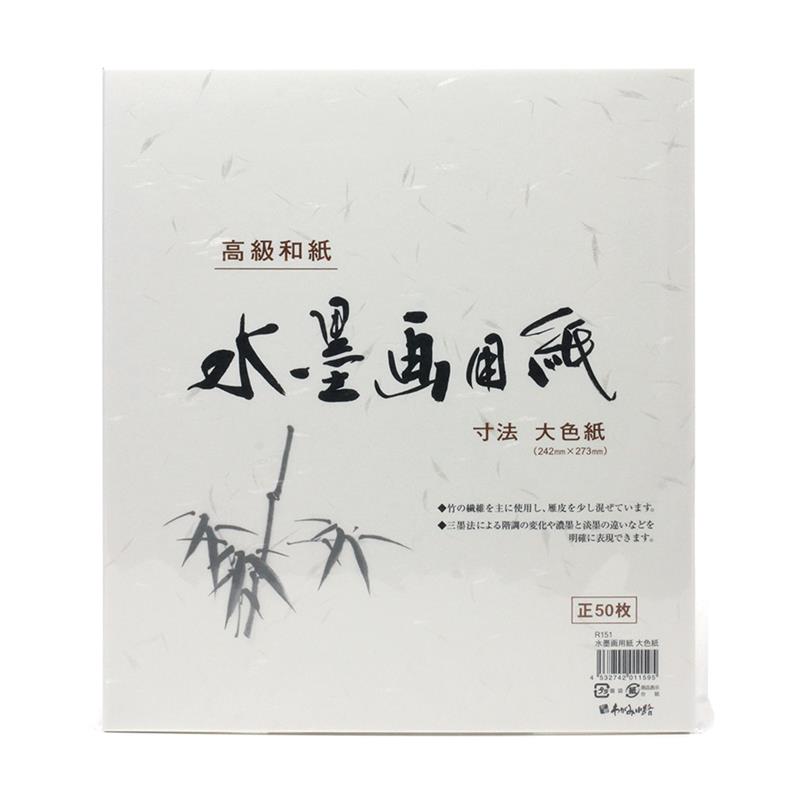 柄名:大色紙 竹の繊維を主に使用し、雁皮を少し混ぜています。 三墨法による階調の変化や濃墨と淡墨の違いなどを明確に表現できます。 【商品仕様】 品番:R151 寸法:273×242mm 内容:1袋 50枚入 素材:竹製パルプ雁皮 個装:OPP袋入 包装:- 備考:墨のぼかし、濃淡が美しく表現できます。 【にじみ具合】よくにじむ