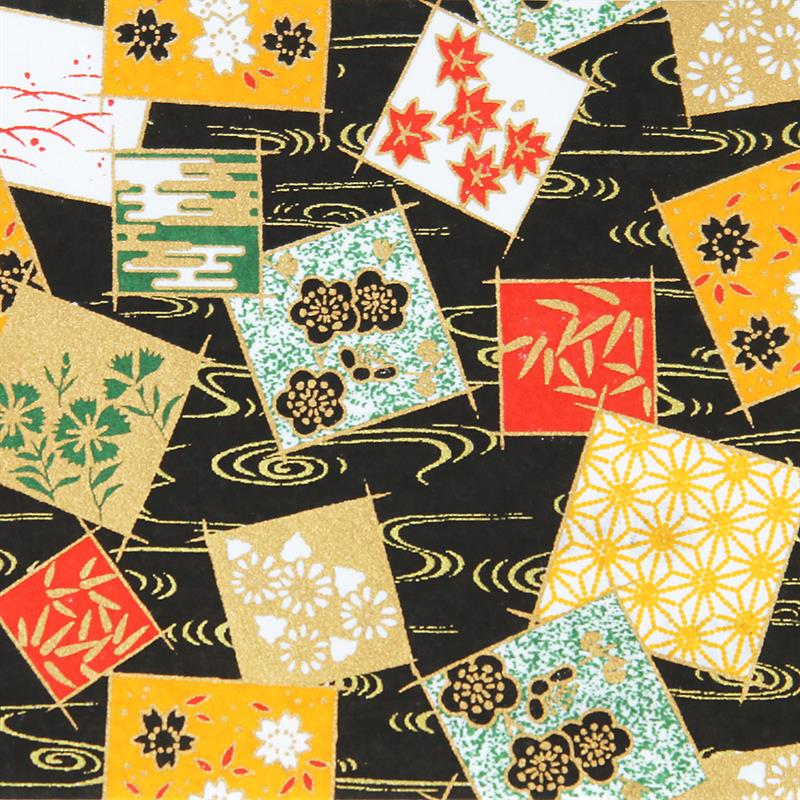 Hand-Dyed Yuzen paper is a kind of decorative paper screen-printed with multi-color. Japanese classical pattern designed with modern touch boldly and delicately, known as “Beauties of nature”, is used on this paper. “Beauties of nature” are also often used in kimono and most these bright, rich colors and motifs signify good fortune. This paper can be used in various ways, for example, wrapping, decorating walls and so on. This paper is made of Echizen washi paper produced in Echizen City (Fukui Prefecture, Japan). Washi paper in this area is designated as an Important Intangible Cultural Property of Japan, and has an established reputation for its high quality. Yuzen paper is hand-dyed color by color, so has some displacements of the patterns and color shadings. Thanks to these, it has a tasteful, unique texture or, a characteristic of hand-dyed products. size: 525 x 660 mm (pattern area: 500 x 635 mm)