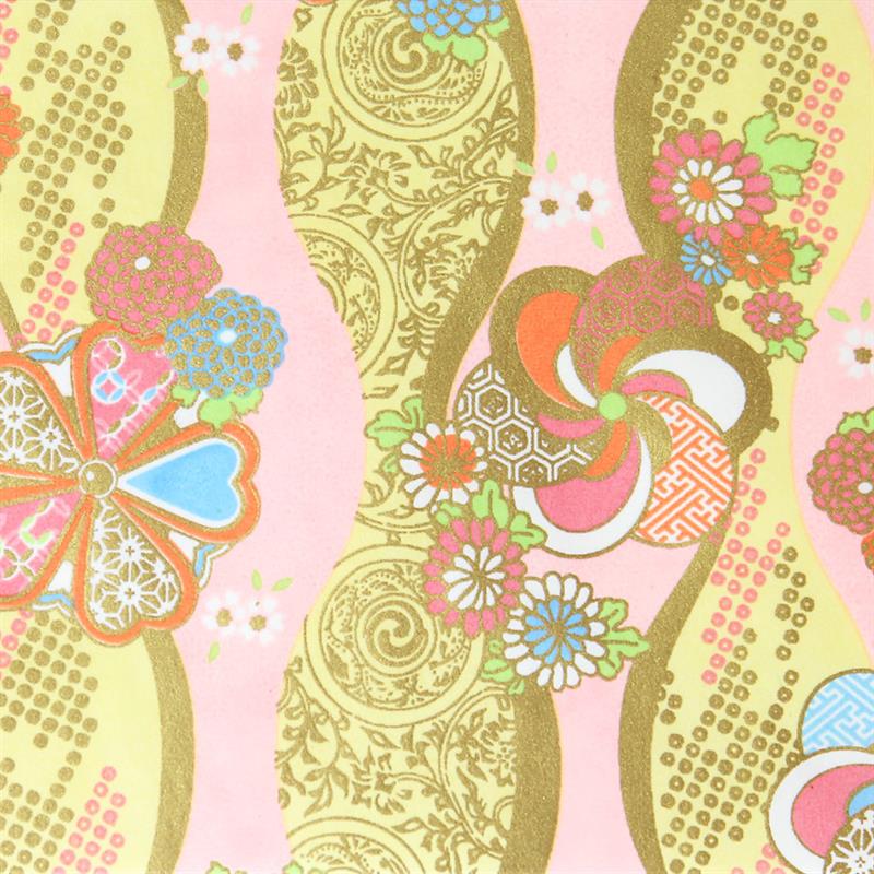 Hand-Dyed Yuzen paper is a kind of decorative paper screen-printed with multi-color. Japanese classical pattern designed with modern touch boldly and delicately, known as “Beauties of nature”, is used on this paper. “Beauties of nature” are also often used in kimono and most these bright, rich colors and motifs signify good fortune. This paper can be used in various ways, for example, wrapping, decorating walls and so on. This paper is made of Echizen washi paper produced in Echizen City (Fukui Prefecture, Japan). Washi paper in this area is designated as an Important Intangible Cultural Property of Japan, and has an established reputation for its high quality. Yuzen paper is hand-dyed color by color, so has some displacements of the patterns and color shadings. Thanks to these, it has a tasteful, unique texture or, a characteristic of hand-dyed products.