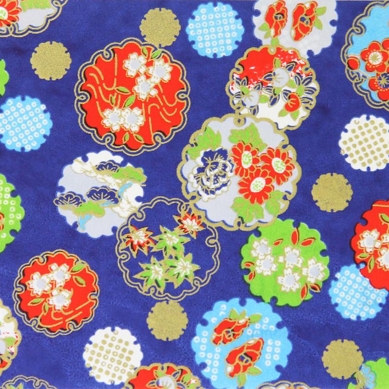 Hand-Dyed Yuzen paper is a kind of decorative paper screen-printed with multi-color. Japanese classical pattern designed with modern touch boldly and delicately, known as “Beauties of nature”, is used on this paper. “Beauties of nature” are also often used in kimono and most these bright, rich colors and motifs signify good fortune. This paper can be used in various ways, for example, wrapping, decorating walls and so on. This paper is made of Echizen washi paper produced in Echizen City (Fukui Prefecture, Japan). Washi paper in this area is designated as an Important Intangible Cultural Property of Japan, and has an established reputation for its high quality. Yuzen paper is hand-dyed color by color, so has some displacements of the patterns and color shadings. Thanks to these, it has a tasteful, unique texture or, a characteristic of hand-dyed products. size: 525 x 660 mm (pattern area: 500 x 635 mm)