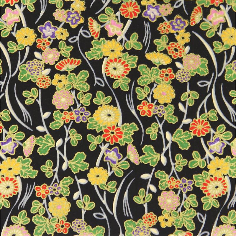 Hand-Dyed Yuzen paper is a kind of decorative paper screen-printed with multi-color. Japanese classical pattern designed with modern touch boldly and delicately, known as “Beauties of nature”, is used on this paper. “Beauties of nature” are also often used in kimono and most these bright, rich colors and motifs signify good fortune. This paper can be used in various ways, for example, wrapping, decorating walls and so on. This paper is made of Echizen washi paper produced in Echizen City (Fukui Prefecture, Japan). Washi paper in this area is designated as an Important Intangible Cultural Property of Japan, and has an established reputation for its high quality. Yuzen paper is hand-dyed color by color, so has some displacements of the patterns and color shadings. Thanks to these, it has a tasteful, unique texture or, a characteristic of hand-dyed products. size: 525 x 660 mm (pattern area: 500 x 635 mm)