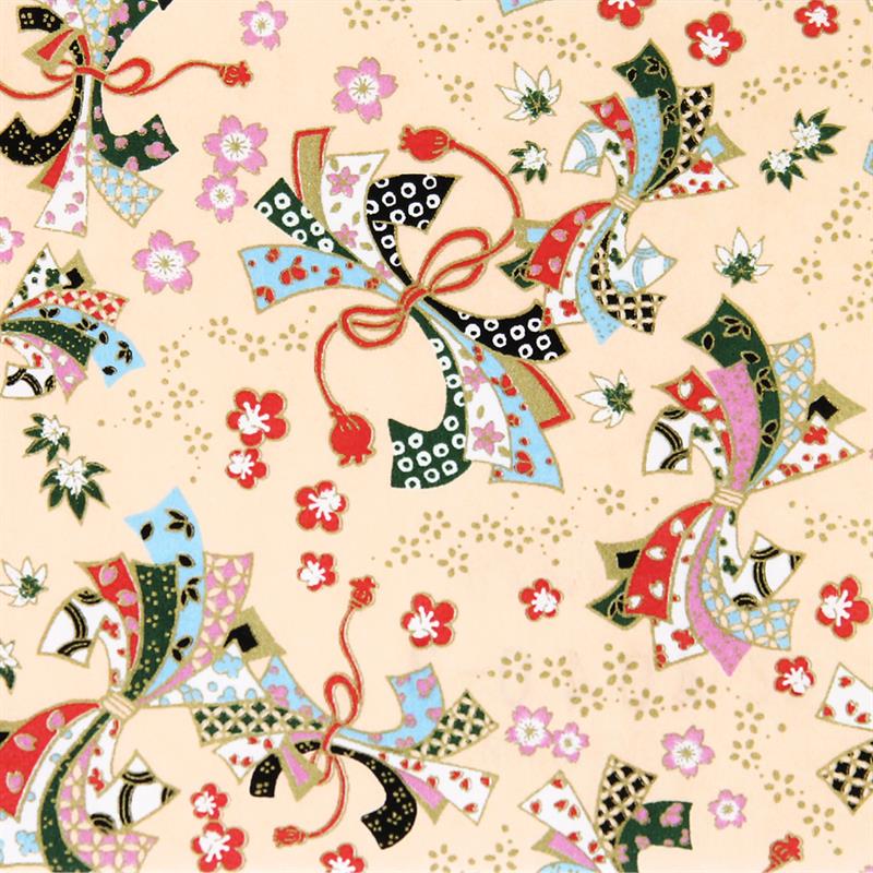 Hand-Dyed Yuzen paper is a kind of decorative paper screen-printed with multi-color. Japanese classical pattern designed with modern touch boldly and delicately, known as “Beauties of nature”, is used on this paper. “Beauties of nature” are also often used in kimono and most these bright, rich colors and motifs signify good fortune. This paper can be used in various ways, for example, wrapping, decorating walls and so on. This paper is made of Echizen washi paper produced in Echizen City (Fukui Prefecture, Japan). Washi paper in this area is designated as an Important Intangible Cultural Property of Japan, and has an established reputation for its high quality. Yuzen paper is hand-dyed color by color, so has some displacements of the patterns and color shadings. Thanks to these, it has a tasteful, unique texture or, a characteristic of hand-dyed products.