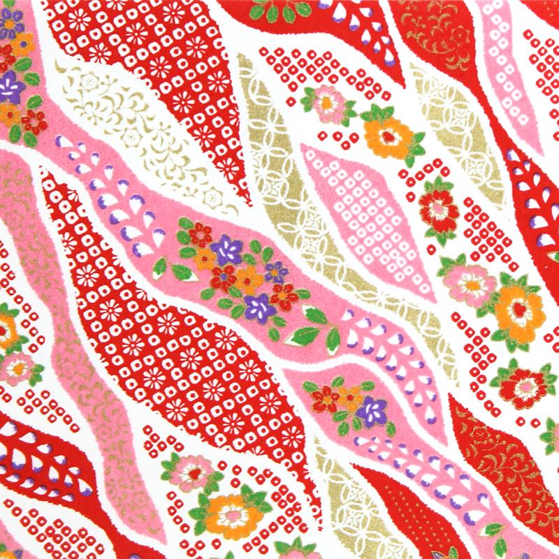Hand-Dyed Yuzen paper is a kind of decorative paper screen-printed with multi-color. Japanese classical pattern designed with modern touch boldly and delicately, known as “Beauties of nature”, is used on this paper. “Beauties of nature” are also often used in kimono and most these bright, rich colors and motifs signify good fortune. This paper can be used in various ways, for example, wrapping, decorating walls and so on. This paper is made of Echizen washi paper produced in Echizen City (Fukui Prefecture, Japan). Washi paper in this area is designated as an Important Intangible Cultural Property of Japan, and has an established reputation for its high quality. Yuzen paper is hand-dyed color by color, so has some displacements of the patterns and color shadings. Thanks to these, it has a tasteful, unique texture or, a characteristic of hand-dyed products.