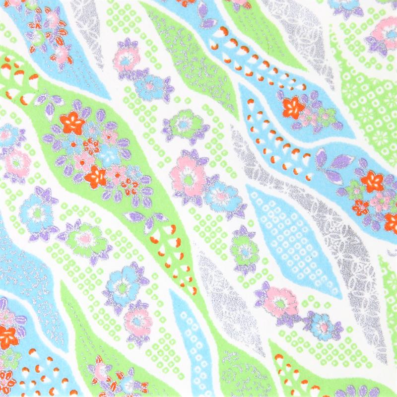 Hand-Dyed Yuzen paper is a kind of decorative paper screen-printed with multi-color. Japanese classical pattern designed with modern touch boldly and delicately, known as “Beauties of nature”, is used on this paper. “Beauties of nature” are also often used in kimono and most these bright, rich colors and motifs signify good fortune. This paper can be used in various ways, for example, wrapping, decorating walls and so on. This paper is made of Echizen washi paper produced in Echizen City (Fukui Prefecture, Japan). Washi paper in this area is designated as an Important Intangible Cultural Property of Japan, and has an established reputation for its high quality. Yuzen paper is hand-dyed color by color, so has some displacements of the patterns and color shadings. Thanks to these, it has a tasteful, unique texture or, a characteristic of hand-dyed products. size: 525 x 660 mm (pattern area: 500 x 635 mm)