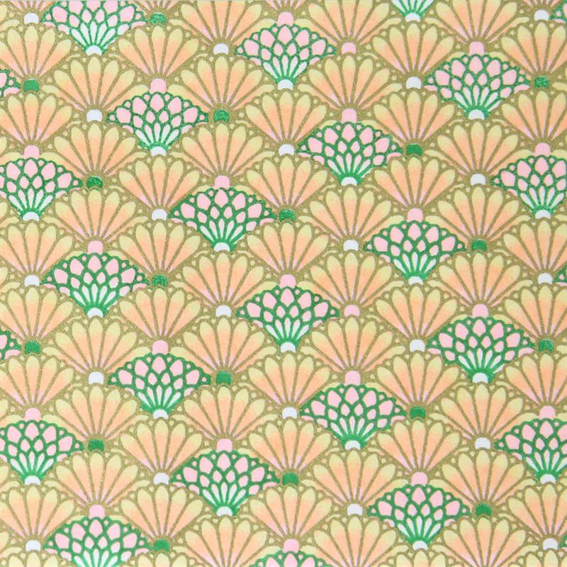 Hand-Dyed Yuzen paper is a kind of decorative paper screen-printed with multi-color. Japanese classical pattern designed with modern touch boldly and delicately, known as “Beauties of nature”, is used on this paper. “Beauties of nature” are also often used in kimono and most these bright, rich colors and motifs signify good fortune. This paper can be used in various ways, for example, wrapping, decorating walls and so on. This paper is made of Echizen washi paper produced in Echizen City (Fukui Prefecture, Japan). Washi paper in this area is designated as an Important Intangible Cultural Property of Japan, and has an established reputation for its high quality. Yuzen paper is hand-dyed color by color, so has some displacements of the patterns and color shadings. Thanks to these, it has a tasteful, unique texture or, a characteristic of hand-dyed products. size: 525 x 660 mm (pattern area: 500 x 635 mm)