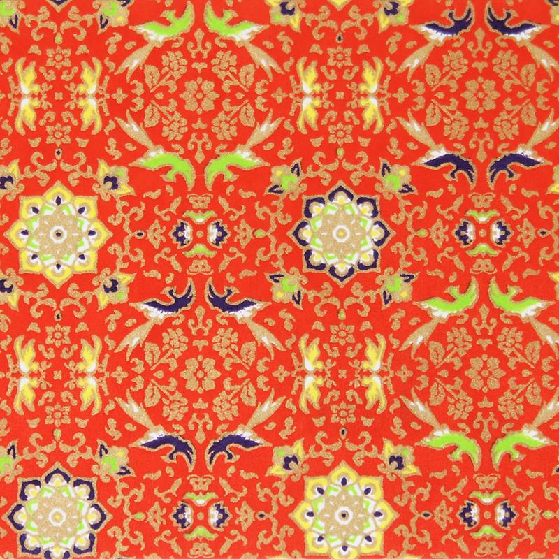 Hand-Dyed Yuzen paper is a kind of decorative paper screen-printed with multi-color. Japanese classical pattern designed with modern touch boldly and delicately, known as “Beauties of nature”, is used on this paper. “Beauties of nature” are also often used in kimono and most these bright, rich colors and motifs signify good fortune. This paper can be used in various ways, for example, wrapping, decorating walls and so on. This paper is made of Echizen washi paper produced in Echizen City (Fukui Prefecture, Japan). Washi paper in this area is designated as an Important Intangible Cultural Property of Japan, and has an established reputation for its high quality. Yuzen paper is hand-dyed color by color, so has some displacements of the patterns and color shadings. Thanks to these, it has a tasteful, unique texture or, a characteristic of hand-dyed products. size: 525 x 660 mm (pattern area: 500 x 635 mm)