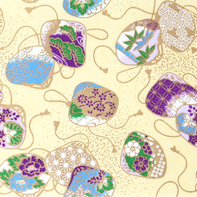 Hand-Dyed Yuzen paper is a kind of decorative paper screen-printed with multi-color. Japanese classical pattern designed with modern touch boldly and delicately, known as “Beauties of nature”, is used on this paper. “Beauties of nature” are also often used in kimono and most these bright, rich colors and motifs signify good fortune. This paper can be used in various ways, for example, wrapping, decorating walls and so on. This paper is made of Echizen washi paper produced in Echizen City (Fukui Prefecture, Japan). Washi paper in this area is designated as an Important Intangible Cultural Property of Japan, and has an established reputation for its high quality. Yuzen paper is hand-dyed color by color, so has some displacements of the patterns and color shadings. Thanks to these, it has a tasteful, unique texture or, a characteristic of hand-dyed products.