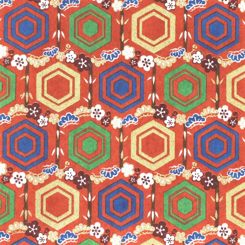 Hand-Dyed Yuzen paper is a kind of decorative paper screen-printed with multi-color. Japanese classical pattern designed with modern touch boldly and delicately, known as “Beauties of nature”, is used on this paper. “Beauties of nature” are also often used in kimono and most these bright, rich colors and motifs signify good fortune. This paper can be used in various ways, for example, wrapping, decorating walls and so on. This paper is made of Echizen washi paper produced in Echizen City (Fukui Prefecture, Japan). Washi paper in this area is designated as an Important Intangible Cultural Property of Japan, and has an established reputation for its high quality. Yuzen paper is hand-dyed color by color, so has some displacements of the patterns and color shadings. Thanks to these, it has a tasteful, unique texture or, a characteristic of hand-dyed products. size: 525 x 660 mm (pattern area: 500 x 635 mm)