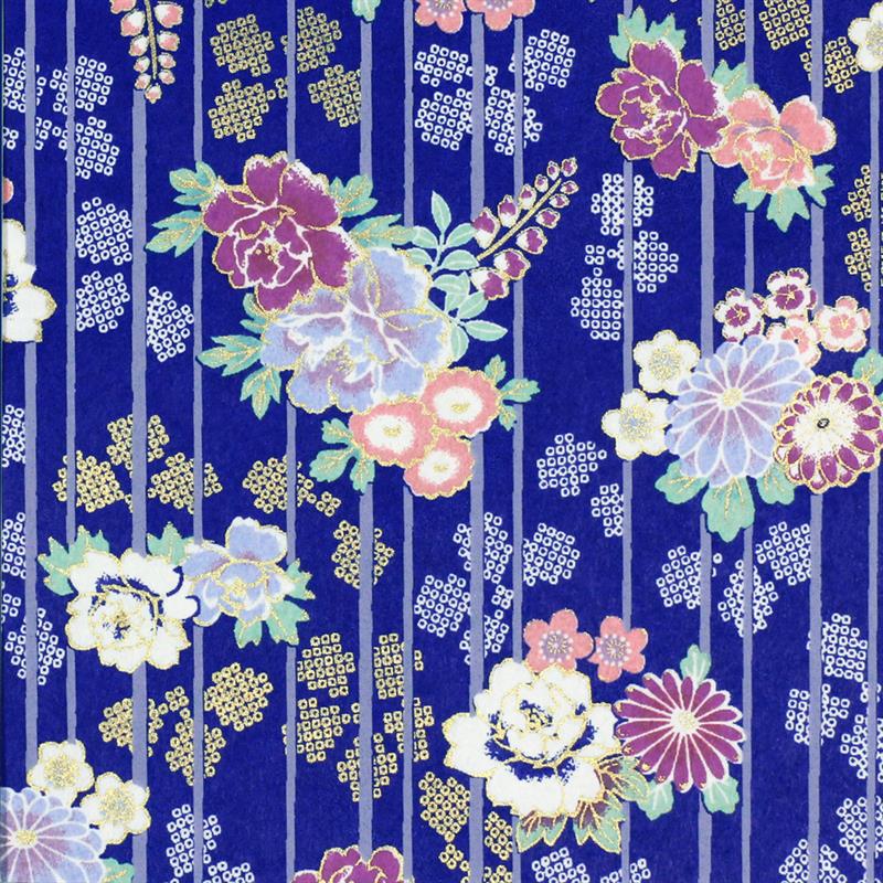 Hand-Dyed Yuzen paper is a kind of decorative paper screen-printed with multi-color. Japanese classical pattern designed with modern touch boldly and delicately, known as “Beauties of nature”, is used on this paper. “Beauties of nature” are also often used in kimono and most these bright, rich colors and motifs signify good fortune. This paper can be used in various ways, for example, wrapping, decorating walls and so on. This paper is made of Echizen washi paper produced in Echizen City (Fukui Prefecture, Japan). Washi paper in this area is designated as an Important Intangible Cultural Property of Japan, and has an established reputation for its high quality. Yuzen paper is hand-dyed color by color, so has some displacements of the patterns and color shadings. Thanks to these, it has a tasteful, unique texture or, a characteristic of hand-dyed products. size: 525 x 660 mm (pattern area: 500 x 635 mm)