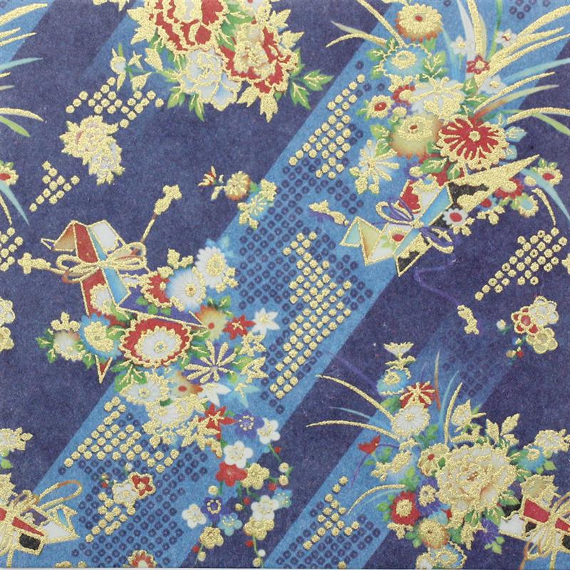 “Kyo” means Kyoto and “koromo” means clothing, especially kimono. On this decorative paper, kimono patterns are used as a motif. Beautiful traditional patterns designed modernly and golden paint are used elegantly and effectively. This paper can be used in various ways, for example, wrapping, decorating walls and so on. This paper is made of Echizen washi paper produced in Echizen City (Fukui Prefecture, Japan). Washi paper in this area is designated as an Important Intangible Cultural Property of Japan, and has an established reputation for its high quality. size: 480 x 650 mm (pattern area: 462 x 632 mm)